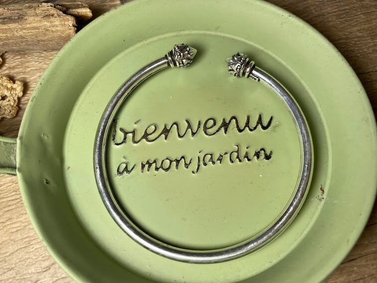 両端に花のつぼみのようなエスニックなデザインが施されたタイシルバーのバングル(ブレスレット)です。